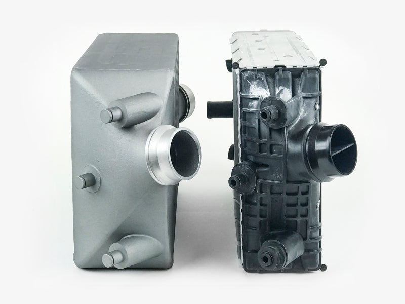 CSF's Porsche 991 Turbo intercoolers have been race-tested, logged, and fully validated by some of the world's best Porsche tuners. These intercoolers have been regarded as the "Go-To" option for the best performance and value available in the performance aftermarket. From first glance the increase in width from the OEM's 80mm core to the CSF's 115mm width is very apparent. Critical for vehicles running performance tunes with bolt-on modifications. Considered a mandatory upgrade for vehicles running upgraded turbo systems. The larger capacity CSF bar/plate core design can handle significantly more airflow + increased boost pressures compared to the OEM intercooler system. CSF's 100% TIG welded cast end tanks, paired with its high-efficiency bar/plate intercooler core. Compared to the OEM style tub/fin core, which is crimped onto the plastic end tanks. The weaker OEM design can crack under high boost or vibrations typical to race conditions. The design of CSF's end tanks allows for airflow to be distributed evenly throughout the entire intercooler compared to the OEM intercooler design which is much shallower. The OEM design makes it more difficult for airflow to reach the top/bottom tube sections at the ends of the intercooler. CSF's Porsche 991 Turbo intercoolers are finished with an aero-space grade, Nano-particle, heat dispersion coating that dissipates heat around 35% better than uncoated raw aluminum. The coating is applied in California, USA by an aerospace coating company who also supplies coatings for Boeing. This unique coating is a key feature to achieving world-record performance, exclusively available from CSF.