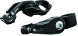 These cruise mounts with positive locking Quick Clamps offer an incredible range of adjustability. The entire assembly may be moved up or down on the engine guard. The arm and footpeg may be further adjusted along a vertical or horizontal arc. A unique clevis permits angle adjustment of the footpeg. The heavy-duty Quick Clamp and sturdy offset arm ensures that the footpegs will clear fairing lowers and will stay where you put them.